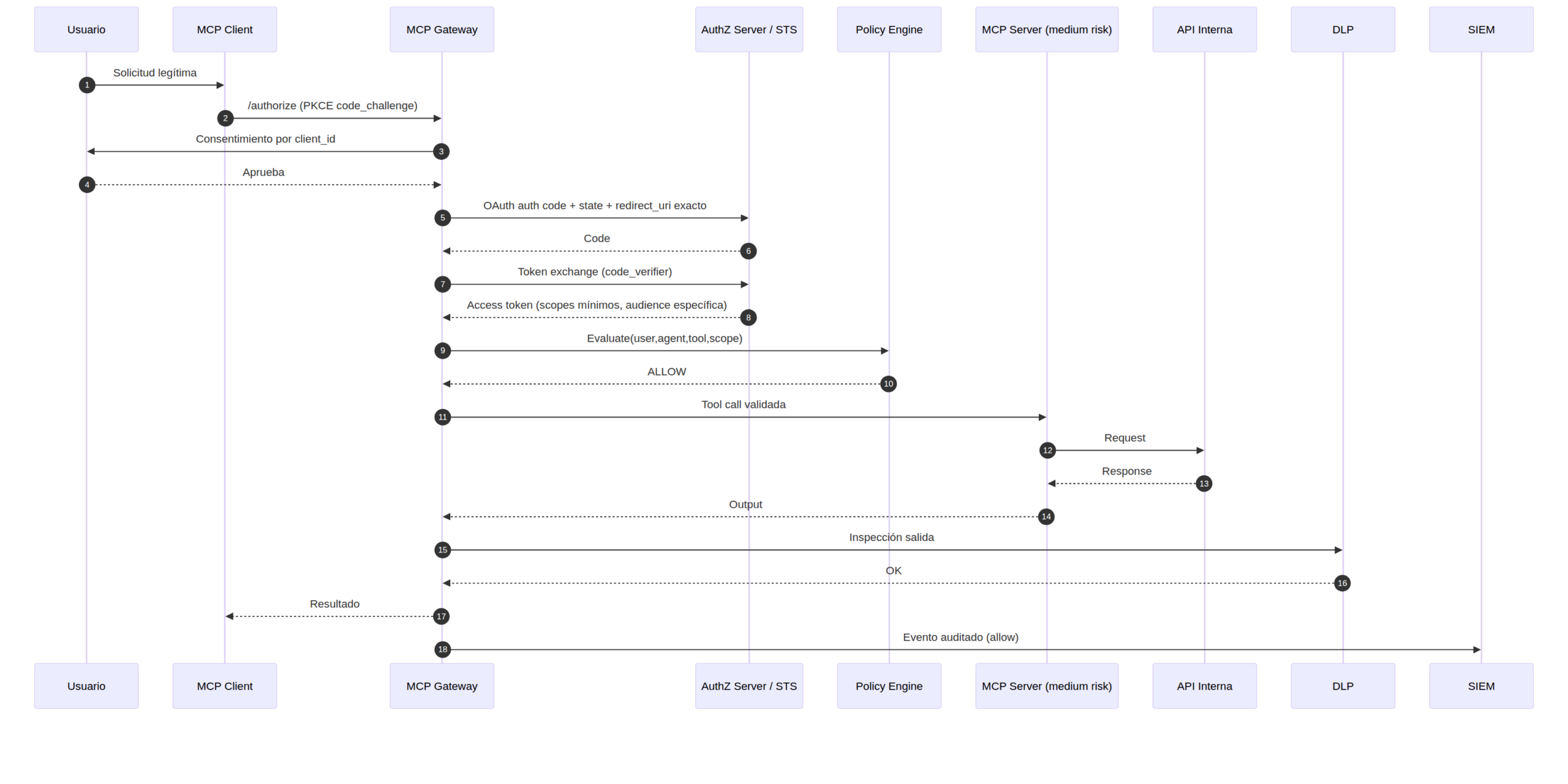 - Sin token passthrough; tokens con audiencia y scopes mínimos por recurso.