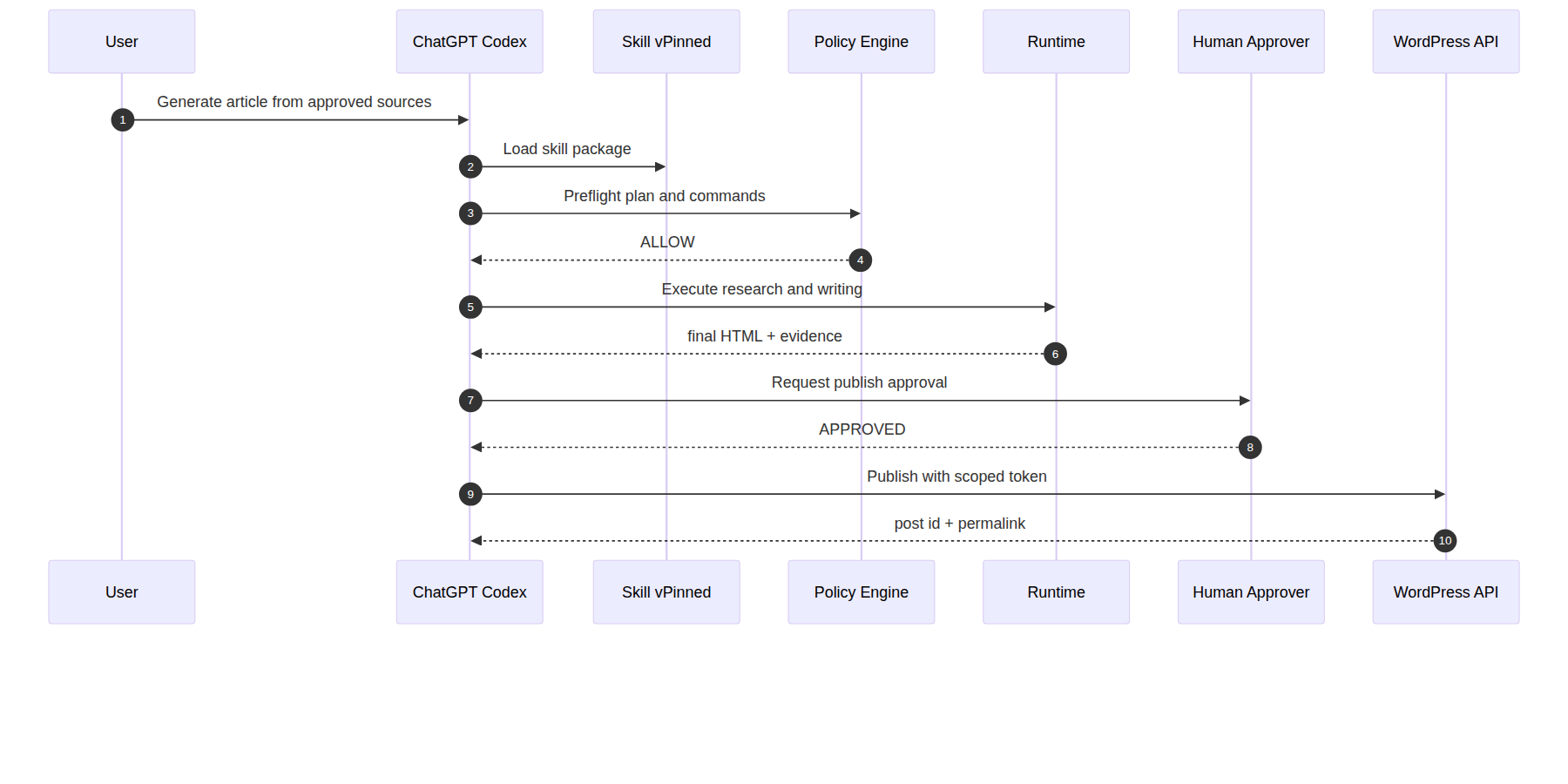 Control clave: separación estricta entre redacción y publicación; el paso de publish requiere confirmación humana.